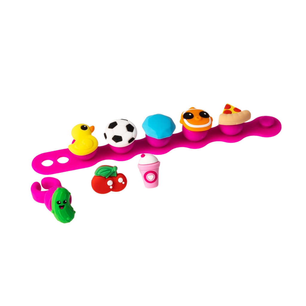 Pick your favorite charms and fit them into the sockets of the silicone bracelet and ring. It's a playful way to accessorize - on your wrists and fingers or even on a backpack - and when you pull them out, they make the most satisfying "POP!" Each set comes with a bracelet, a ring, and eight unique charms.
