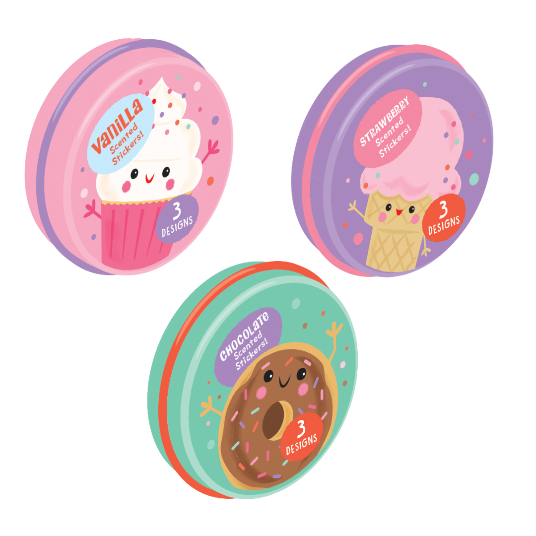 These tiny sweet scented stickers are designed to add a touch of fun to your day. Each tin features 3 different designs of sweet treats with a hidden surprise - a delightful scent that is revealed with a simple scratch!
