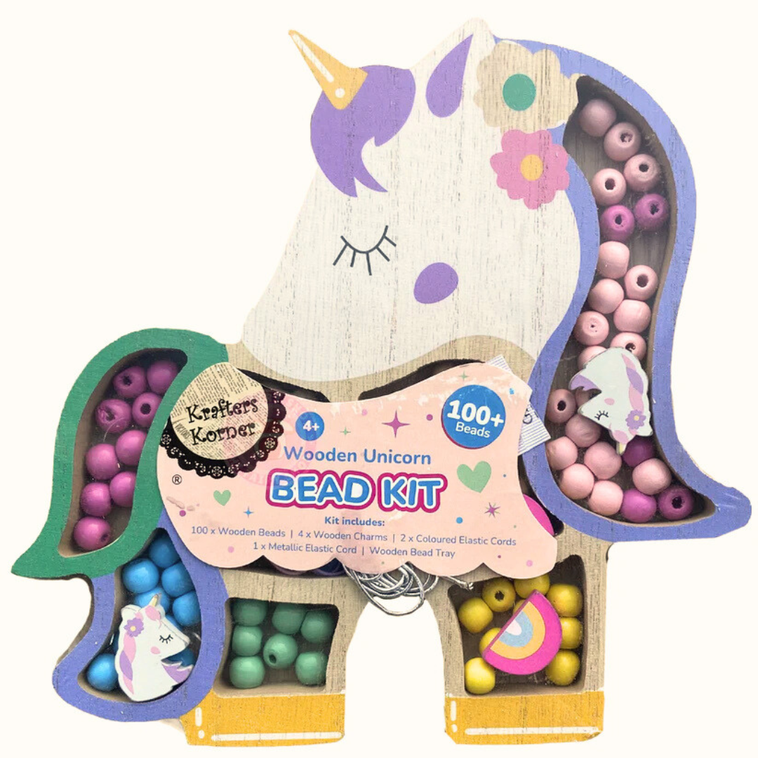 Make charming jewellery with this delightful Unicorn Wooden Bead Set. It includes around 100 vibrant wooden beads in a rainbow of colours, all neatly kept in a whimsical unicorn-shaped wooden box. The set features 4 wooden charms, two colourful elastic cords, one shiny metallic elastic cord, and a wooden bead tray to keep everything tidy and ready for your next creative adventure.
