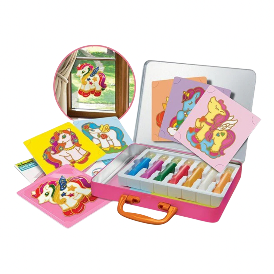 Turn your windows into a world of vibrant colours with this magical unicorn-themed craft kit! The tin carry case includes paints, stencils, and clear sheets—everything you need to create your own dazzling unicorn designs.