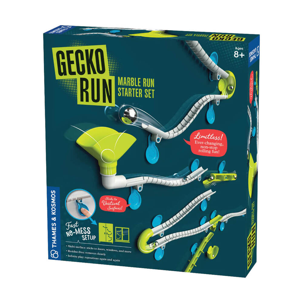 Gecko Run takes classic marble runs to the next level with new creative challenges and less restrictive building requirements. This innovative marble run uses a specially designed system of flexible tracks that does not require any support structures. Traditional marble runs require lots of pieces to create vertical height, but with Gecko Run, your doors, windows, cupboards, bookcases – virtually any smooth surface – become part of your track, allowing you to build higher with fewer pieces.