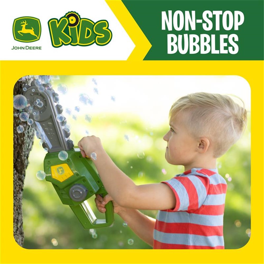 Battery-operated bubble blower that brings chainsaw action to playtime! This motorised marvel features a realistic John Deere design complete with authentic mechanical sounds that'll have kids giggling with every pull of the trigger.