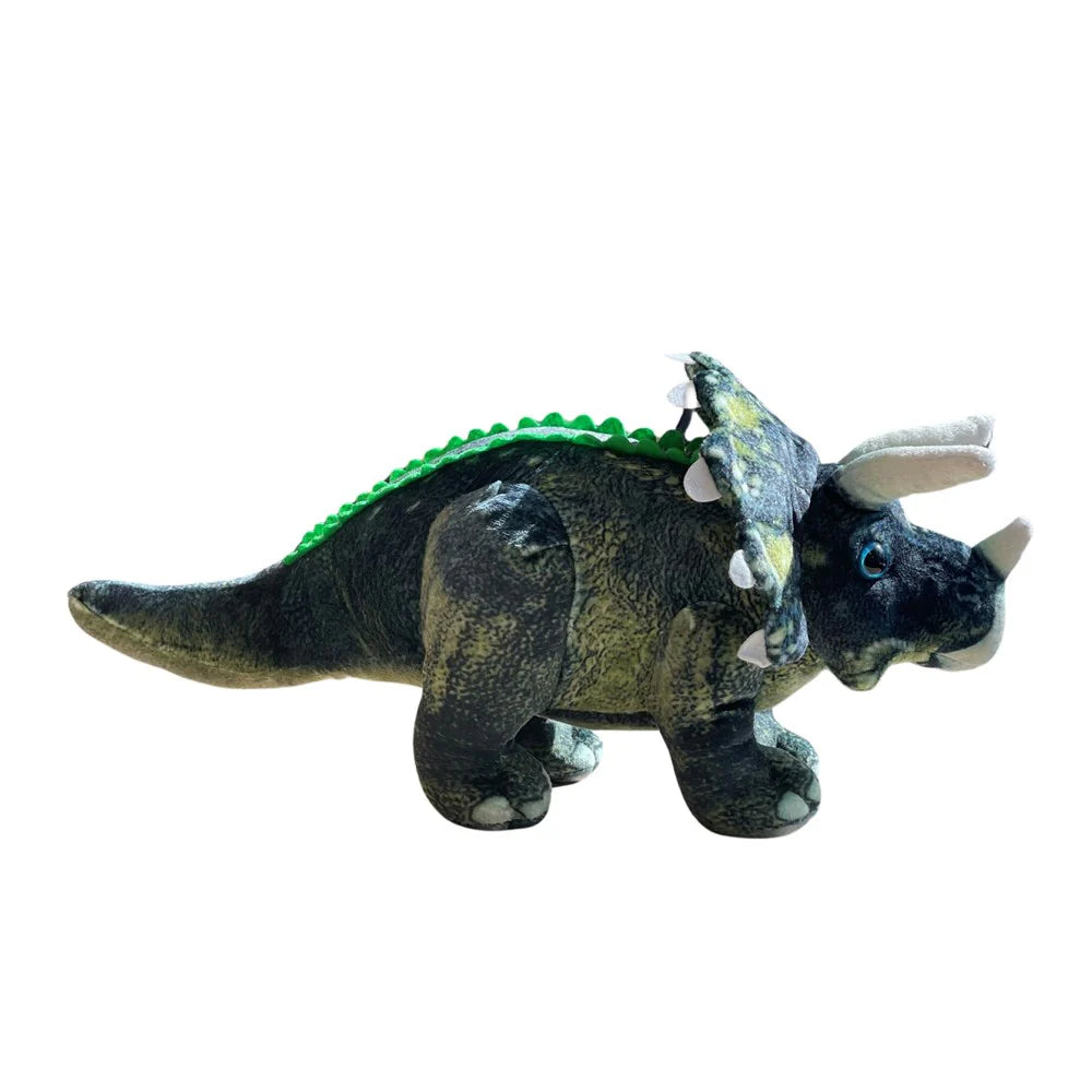 This plush toy features the distinctive three-horned face and shield-like frill of the beloved Triceratops, brought to life with vibrant colors and soft textures.