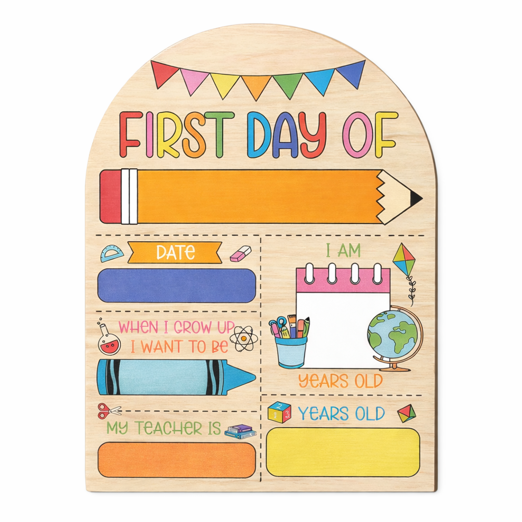 Fill in the details—from the date and age to their teacher's name, what they want to be when they grow up, and all the things they love right now. Crafted from sturdy plywood, it's built to last through countless first days, making it an ideal keepsake for photos and memories.