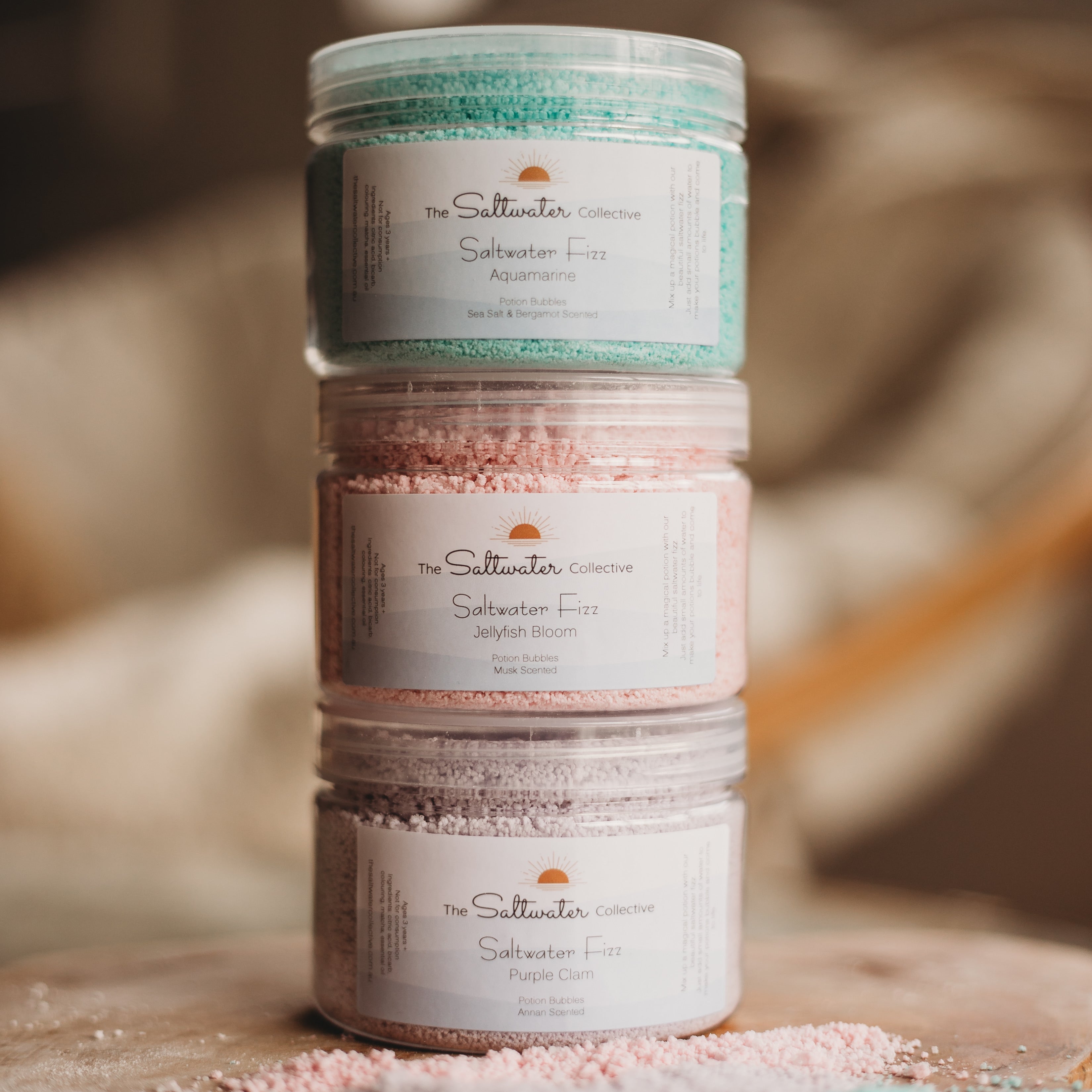 Use The Saltwater Collective fizz in your mud kitchen, add leaves, twigs and flowers or whatever you can forage from your garden and make your own potion magic, bottle it up to keep your potions magic active.